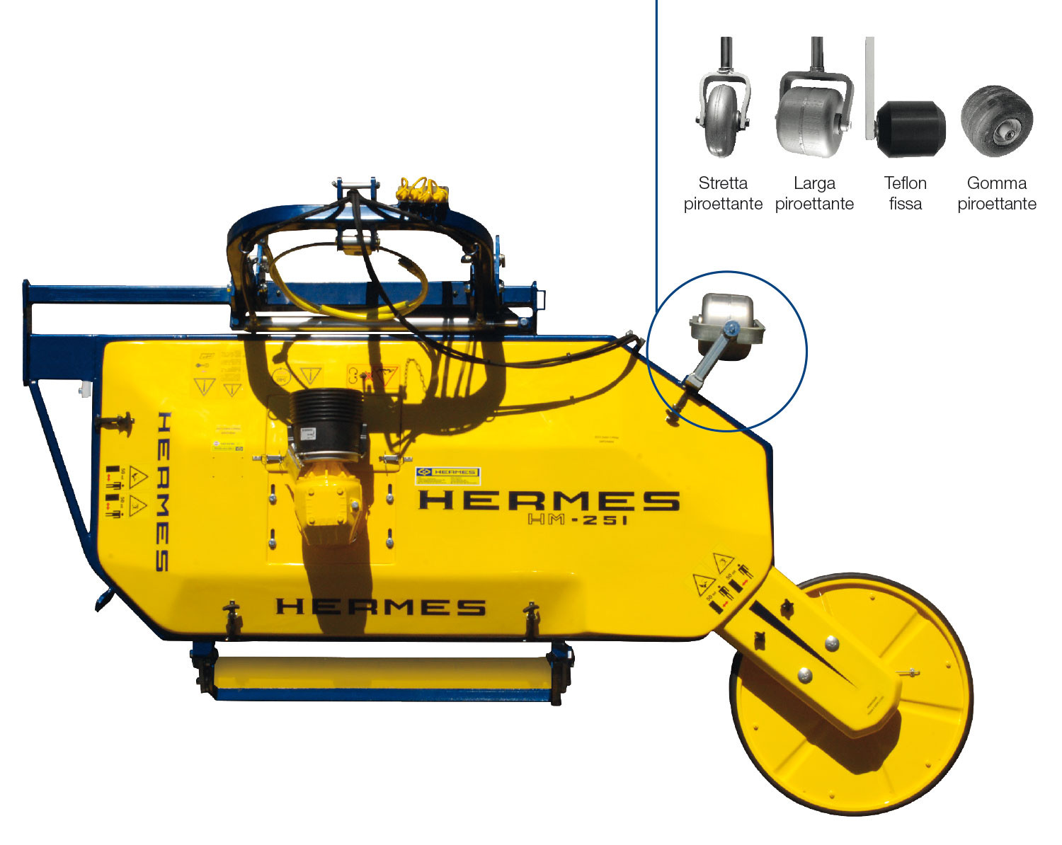 Die erweiterte hydraulische Seitenverschiebung erlaubt eine um 20cm erhöhte seitliche Auslegung in Bezug auf die Traktormitte. Alle Maschinen können je nach Bodenanforderung, mit unterschiedlichen Stützrädern ausgerüstet werden (schmal lenkbar, breit lenkbar, Teflon fix, Gummi fix). Auf Anfrage kann auch die rückwärtige Laufwalze durch Räder ersetzt werden.