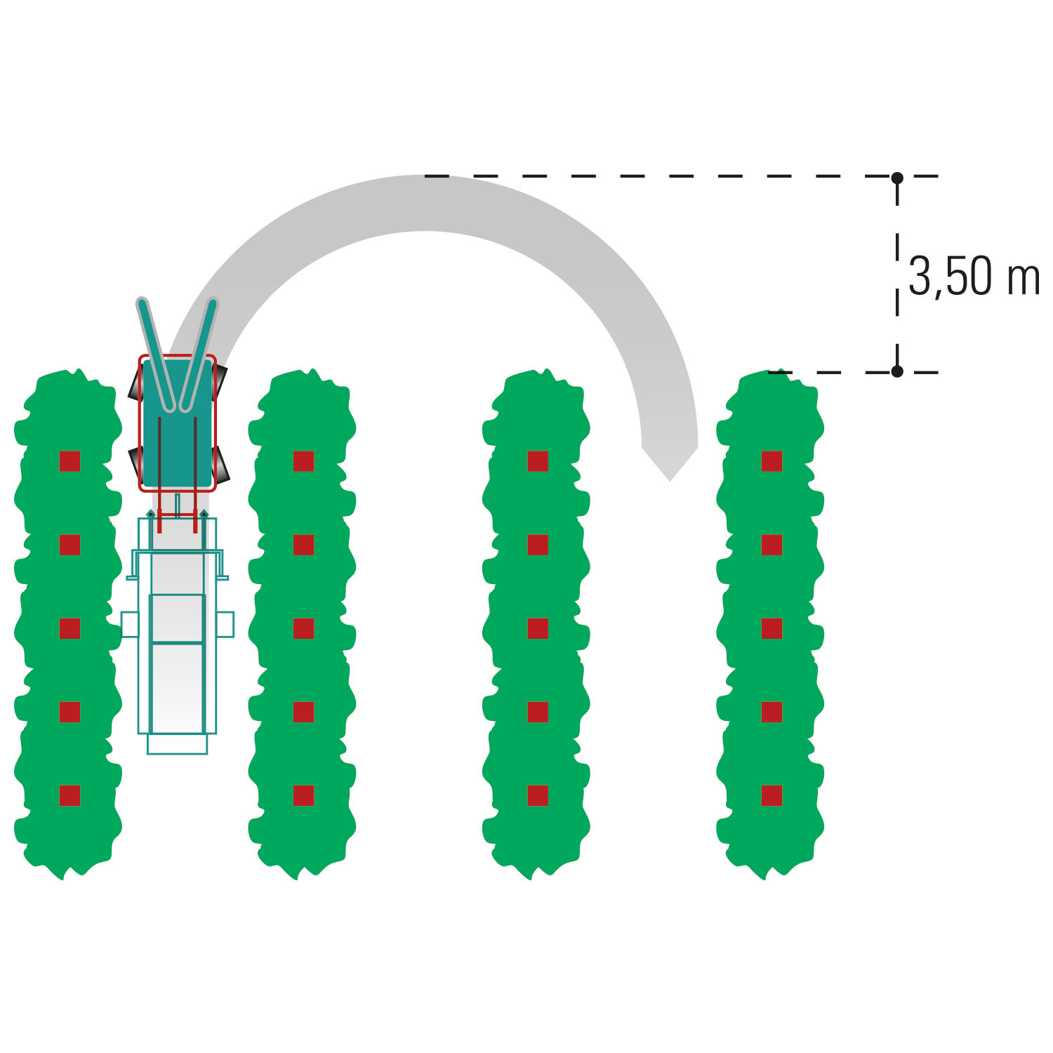 Compact machine for plants with 3.00 to 3.90 m inter-row and maximum height of 3.60 m of the plant. The rich standard equipment and a complete range of accessories allow customizing the machine according to the needs of modern fruit farmers. Equipped with a reliable 3-cylinder diesel engine that allows low fuel consumption and emissions according to the latest enviromental regulation.
