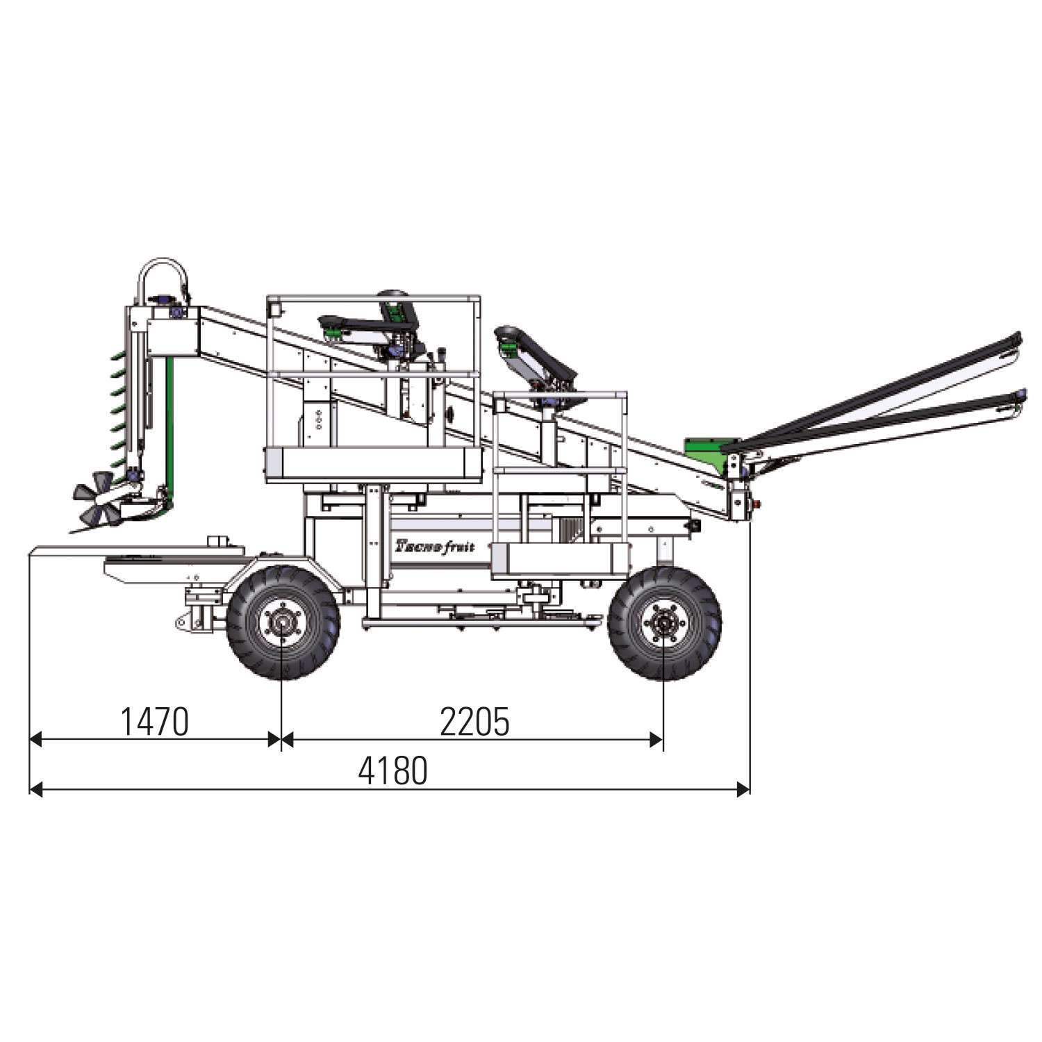 The 4 side platforms (1.25 x 0.36 m rear platforms - 0.80 x 0.36 m front platforms) allow 3 levels of harvesting in a very compact machine.