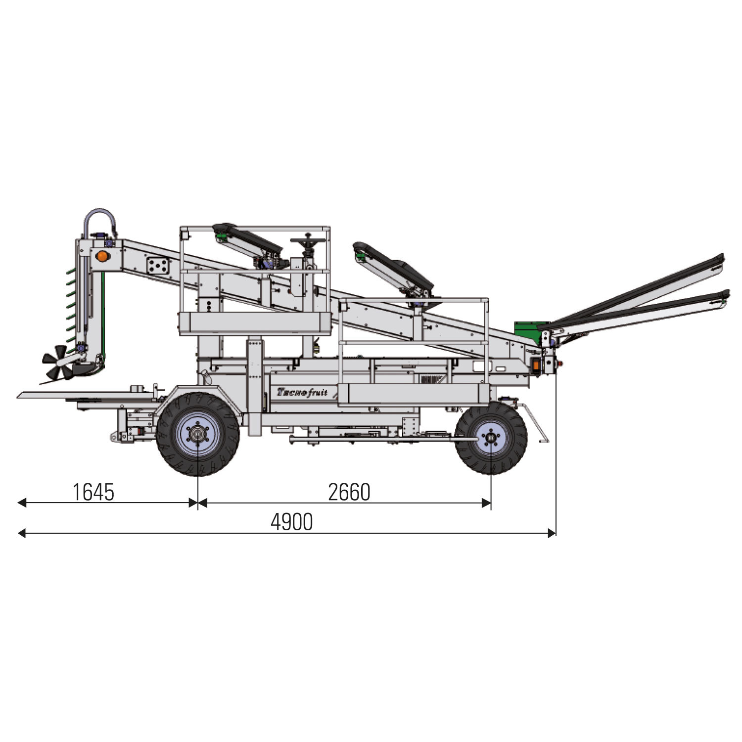 Obsterntemaschine für Reihenbreiten von 3,60 bis 4,50 m und Pflanzenhöhen